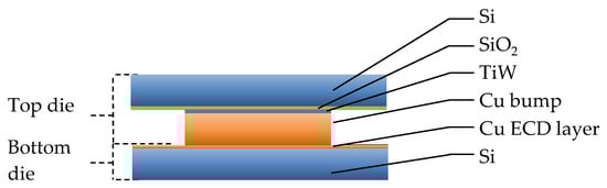 The applied thermocompression bonding technique can be described as follows. Bonding was carried out in the N2-purged bonding chamber of the Alpha Design TC bonder. Table 2 shows the main bonding parameters used in these experiments. Initially, the top die was placed face-down in the center of the face-up bottom die lying on a heating stage in the bonding chamber. Then, the chamber was evacuated until the pressure reached 0.09 MPa. Subsequently, the chamber was continuously purged with Ar and retained a pressure of 0.1 MPa.
