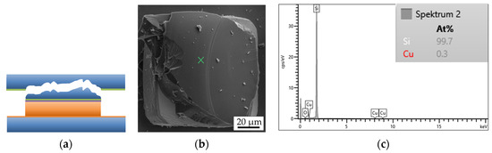 Si fracture surface type of a single interconnect: (a) schematic view, (b) SEM image of the bottom side, (c) EDX graph of the marked position on the SEM image.