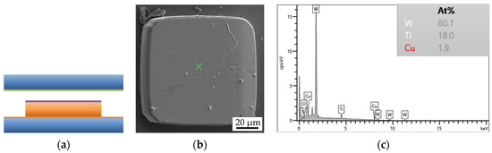 TiW fracture surface type of a single interconnect: (a) schematic view, (b) SEM image of the bottom side, (c) EDX graph of the marked position on the SEM image.