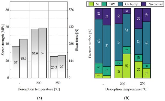 The shear strength tests are performed on the interconnects after the bonding procedure to characterize their mechanical strength. Figure 18 shows the results of these tests and the distribution of the fracture surfaces on the bottom dies. Each column represents one sample pair. The data indicate that oxide growth, which increases with higher desorption temperatures, affects the shear strength of the interconnects. The samples with a 250 °C desorption exhibit the lowest shear strength values in the range of 25–27 MPa, while those with a 200 °C desorption temperature have the highest values in the range of 58–59 MPa. Interestingly, samples with SAM (no desorption) can also be bonded with relatively high shear strength values of 37–46 MPa; however, these samples have a lower percentage of Si fractures of 5–7% compared to the other samples with values of 14–35%. The highest rate of Si and TiW fractures is observed for the samples with desorption at 200 °C.