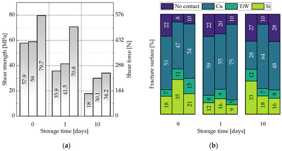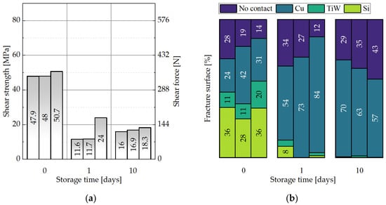 Influence of the storage time for 0, 1, and 10 days at −18 °C for the dies without the SAM coating on: (a) the shear strength, (b) the distribution of the fracture surface types.