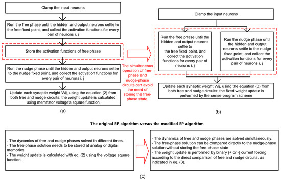 The EP algorithm modeled with the Hopfield energy can be considered an alternative way to the conventional backpropagation algorithm, in which very complicated digital circuits external to neural network neurons and synapses are needed for performing its global learning process [28]. Unlike the backpropagation algorithm, the EP algorithm with Hopfield energy can be trained using the local learning rule, where a weight update can be calculated using information from only neighboring neurons. The hardware for local learning can be implemented using much simpler analog circuits, which can be regarded as being more similar to the real operation of the human brain [21,22,23,32]. Figure 1a presents a flowchart of the original EP algorithm [28]. As indicated in Figure 1a, the operation of EP comprises two phases: free and nudge phases [28]. The dynamic equations of the free and nudge phases in Figure 1a are solved one by one at different times.