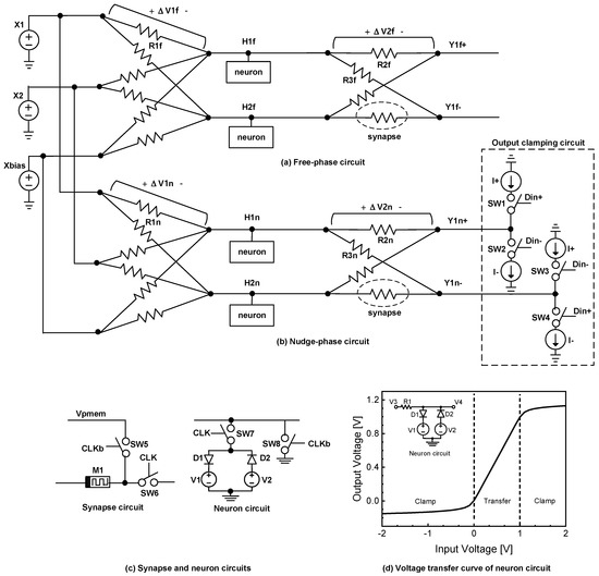 (a) Memristor–CMOS hybrid circuit for calculating the free-phase solution that is not affected by the training vectors; (b) memristor–CMOS hybrid circuit for calculating the nudge-phase solution with the output clamping circuit; (c) synapse and neuron circuits; (d) voltage transfer curve of the neuron circuit. Here, the upper and lower limit voltages can be controlled by V1 and V2, respectively.