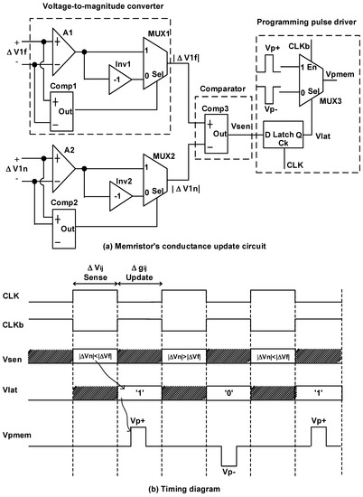 Figure 3a shows a memristor conductance update circuit that compares the memristor voltage magnitude between the free-phase and nudge-phase circuits and drives the programming pulse to the memristor synapse shown in Figure 2c according to the comparison result. Here, ∆V1f and ∆V1n are from the free-phase and nudge-phase circuits shown in Figure 2a,b, respectively. The circuit is composed of a voltage-to-magnitude converter, comparator, and programming pulse driver, as depicted in Figure 3a.