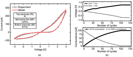 Figure 4a shows a cross-sectional view of the evaluated memristor device composed of a top electrode, memristor film, and bottom electrode [36,38]. The measured and modeled butterfly curves are also shown in Figure 4a [36]. Here, the black line with the solid box represents the experimentally measured butterfly curve. The red line denotes the modeled butterfly curve. The measurement of the butterfly curve of the memristor was performed with the Keithley 4200 semiconductor parameter analyzer (Semiconductor Characterization System, Tektronix, Inc., Beaverton, OR, USA) by using the probe station with a shield box. The mathematical modeling equations can be found in detail in the previous reference [36,39]. The modeling equations for the memristor were programmed in Verilog-a. The simulation performed with the programmed Verilog-a code using CADENCE SPECTRE circuit simulator (Cadence Design Systems, Inc., San Jose, CA, USA) is depicted in Figure 4a.