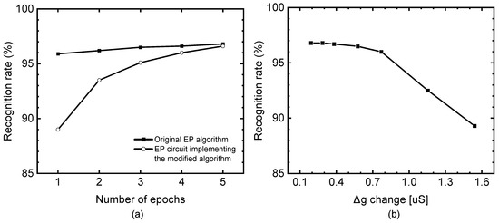 Figure 5a compares the recognition rates of the original EP algorithm and the EP circuit implementing the modified EP algorithm. The original and modified EP algorithms are presented in Figure 1a,b, respectively. Here, the dataset used in this simulation is the MNIST hand-written digits dataset [40]. In the MNIST dataset, the numbers of training and testing vectors are 60,000 and 10,000, respectively. The original EP algorithm was simulated with PyTorch, and the recognition rate was simulated as high as 96.9% when the number of epochs was 5. The modified EP algorithm shown in Figure 1b can be implemented by using the memristor–CMOS hybrid circuits, as shown in Figure 2 and Figure 3. The recognition rate of the EP circuit implemented with the memristor–CMOS hybrid circuit was simulated using Ngspice circuit simulator and Python. The results of the simulation revealed a recognition rate as high as 96.7% for epoch number = 5. The gap between the original EP algorithm and the EP circuit implementing the modified EP algorithm was as little as 0.2%. The gap of the recognition rate between the original EP algorithm and the proposed EP circuit could be caused by the difference in learning rule. As explained earlier, the original EP algorithm uses the learning rule given by Equation (2). By contrast, the proposed EP circuit implementing the modified EP algorithm is trained by the modified EP learning rule given by Equation (3). The amount of conductance update per clock cycle in Equation (2) can be changed according to the amount of output error. However, the amount of ∆g in Equation (3) is fixed regardless of the amount of output error. The fixed amount of ∆g can degrade the performance of the neural network, as shown in Figure 5a.