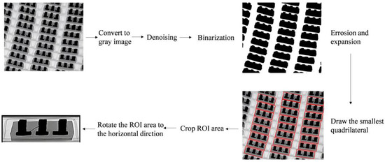 Due to the special nature of chip inspection, CT equipment is used to obtain the internal defects of the chip. As shown in Figure 1, the chip is placed on a rotating platform, and X-rays pass through the chip; the X-ray intensity will be attenuated to different degrees, and the detection panel will receive the attenuated X-ray intensity. Finally, by leveraging the intensity information of the rays, an X-ray image is reconstructed to depict the internal structure of the chip accurately. Pre-processing the obtained images is an important step to improve the correct rate of detecting lead bonding defects. In order to obtain better image quality and reduce the effect of noise on subsequent detection, image denoising is performed on the acquired images. In this paper, we first implement a typical method based on a median filter to remove the pepper noise from the image. With this nonlinear filtering process, the noise caused by various signal transmission errors can be well removed, while the edge information of the lead is well preserved. The wire part of the image is subsequently cropped to obtain the region of interest (ROI), which can largely reduce the influence of the background on the recognition results.