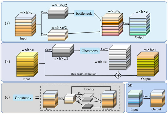 Han et al. [36] pointed out that due to the process of feature extraction by the network, a significant portion of redundant and duplicated features can occur if the number of channels is too large. Therefore, to achieve a better balance between extracting enough features and computational cost, the Ghostconv module was proposed. When compared with standard convolution, ghost convolution results in a substantial decrease in both computational workload and parameter quantity and the result of feature extraction is not much different from normal convolution. In this paper, we detail how the CGC module is constructed based on adopting Han’s similar idea. As illustrated in Figure 4, the CGC module uses a residual structure. Firstly, the number of channels will be reduced to c/2 using a standard convolution of 3 × 3. The result is input into Ghostconv, and then, by utilizing a 1 × 1 convolution, the number of channels is expanded to align with the dimensions of the original input feature map. This enables the addition operation to be carried out between the original input feature map and the resultant feature map. The inclusion of the residual connection guarantees the stability of the network.