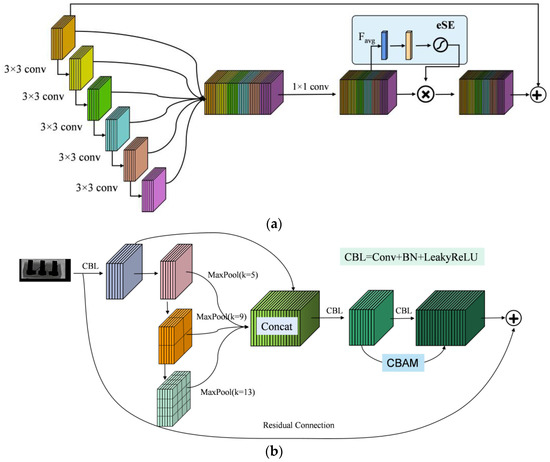 (a) The structure of the OSA + residual + eSE module; (b) the structure of the ATSPPF module.