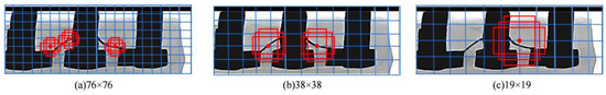 Different feature maps have different sensory receptiveness and different sensitivities to the same size lead bonding defects. Yolov5s eventually predicts feature maps of 19 × 19, 38 × 38, and 76 × 76 in size. Among them, the 76 × 76 feature map is more suitable for detecting small targets, while for medium and large targets, feature maps of 19 × 19 and 38 × 38 in size are more effective. As illustrated in Figure 6, the feature maps are 76 × 76, 38 × 38, and 19 × 19 from left to right scale, respectively. For the 76 × 76 feature map, the resulting anchor box is too small to completely contain the defective parts, while for the 19 × 19 and 38 × 38 feature maps, recognition is better. Therefore, in order to reduce the complexity and computational effort of the network, we use feature maps of 13 × 13 and 26 × 26 in size based on yolov3-tiny. There are three different feature scales and corresponding anchor sizes of yolov5s. In Figure 6, the sizes of the anchors are not in proportion to the real anchor frame size, and this just wants to express that the different sizes of anchors will affect whether the objects can be detected.