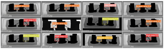 Here, we benchmark our approach against state-of-the-art defect detection methods. Table 4 lists the details of different performance indicators (mAP0.5, FPS, GFLOPs). It can be seen from Table 5 that the method proposed in this paper has great advantages in precision and detection speed compared with other methods. The detection results can be guaranteed that mAP0.5 reaches 99.4% when the detection speed is 146 FPS. For Faster R-CNN-ResNet50, Dynamic RCNN-ResNet50, and RetinaNet-ResNet50, their detection speed is less than 30 FPS, which is far from the requirement of real-time wire bonding detection. Due to their great GFLOPs, these methods also have high hardware requirements. Compared with YOLOv3-tiny, which has a similar network structure, the detection accuracy and speed of both are similar, but our method is much lower than YOLOv3-tiny in terms of both model size and computational complexity (GFLOPs), and the detection speed is nearly 50% higher than the baseline yolov5s. Our method has demonstrated its effectiveness in detecting defects, as illustrated in Figure 7. The detection results of our approach on the test dataset of Dataset-WBD are depicted.