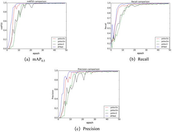 In addition, in order to validate the effectiveness of the ATSPPF module, the module was introduced into the backbone tail part of other networks for training, and the results are shown in Table 6. From the table, it is apparent that the introduction of the ATSPPF module improves the Recall and mAP0.5–0.95 of the yolov3 network by 0.8% and 1.1%, respectively. In Faster-RCNN, although there is a small decrease in Recall, the accuracy is improved by 0.3%, and both mAP0.5 and mAP0.5–0.95 have a larger improvement. For different SSD backbone networks, almost four indicators have been improved to varying degrees. In addition, for the three networks, YoloR [39], LFyolo [40], and Sclaed_yolov4, the overall comprehensive detection performance has also been improved by introducing the ATSPPF module at the end of the feature extraction network. This shows that ATSPPF uses a pooling operation to fuse receptive field with different scales and introduces an attention mechanism, which can extract multi-scale information of the image, making the feature map have more abundant expression ability, thus effectively improving the detection performance of the model. In the network architectures of YOLOv5 and YOLOv3, both models incorporate three detection heads. This necessitates the network to allocate additional time for positional regression of targets detected by different prediction heads. However, it is possible that an object may be detected simultaneously by two detection heads, significantly impacting the convergence speed of the network. Therefore, as depicted in Figure 8, it can be observed that ATNet, which incorporates two detection heads, achieves faster convergence rates than YOLOv5 and YOLOv3 across three metrics: mAP0.5, recall, and precision. This also reflects the effectiveness of the ATSPPF module and the network structure we have designed from another perspective.