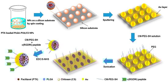 2.3. Preparation of cyRGDfk-Conjugated PTX-PLGA/CS-Au Half-Shell NPs (PTX-PLGA/Au-HS-RGD NPs)