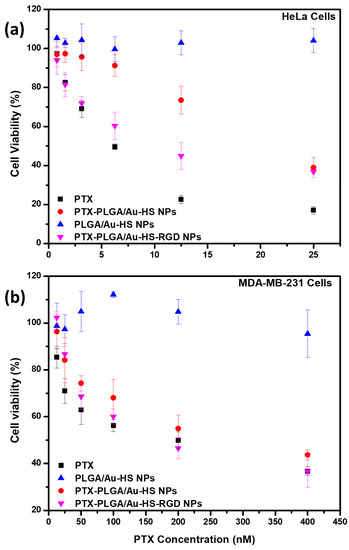 3.1. Synthesis and Characterization of PTX-PLGA/Au-HS-RGD NPs
