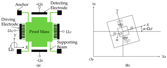 Figure 1. Model of a comb-tooth micro gyroscope: (a) Schematic representation of the micro gyroscope; (b) Equivalent spring-mass model of the micro gyroscope.