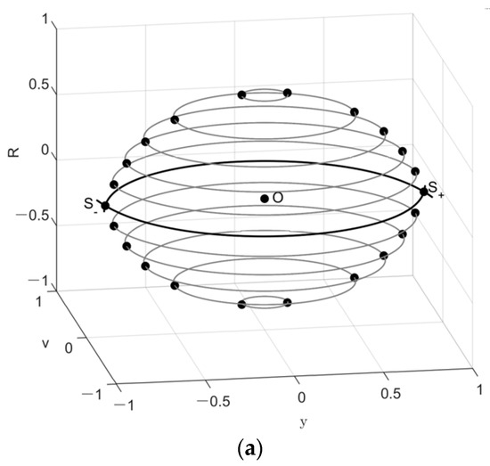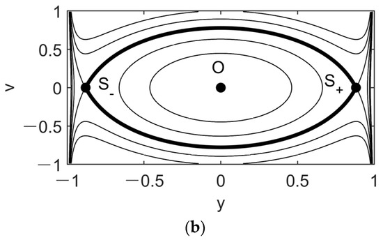 Because Equation (17) satisfies 0 < β < 1 , static pull-in does not occur. Instead, there is a potential well surrounded by heteroclinic orbits, as can be seen in Figure 2. For a fixed value of R, the heteroclinic orbits of the unperturbed system (12) can be observed in a plane parallel to the y-O-v plane. Here the black dots in Figure 2 represent saddle points. For R = 0, the projection of the heteroclinic orbits can be observed intuitively in the y-O-v plane (see Figure 2b). The sensitive mass undergoes a free stable oscillation in the detecting direction if its initial state is disturbed from the center and within the surroundings of the heteroclinic orbits (see the thick closed loop in Figure 2b). However, if its initial conditions are chosen outside of these surroundings, it undergoes an unbounded motion, as shown in the open loop trajectories in Figure 2b, implying dynamic pull-in. In other words, whether the phenomenon of pull-in occurs depends on the initial conditions of system (11). Therefore, the initial sensitivity for dynamic pull-in, namely pull-in instability, can be discussed only if Equation (9) is satisfied.
