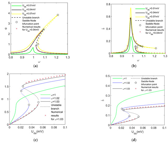 Figure 3. Variation in the amplitudes of periodic solutions in two directions with the driving AC voltage: (a) Frequency response in the driving direction; (b) Frequency response in the detecting direction; (c) Amplitude of driving AC voltage versus magnitude of the driving direction; (d) Amplitude of driving AC voltage versus magnitude of the detecting direction.