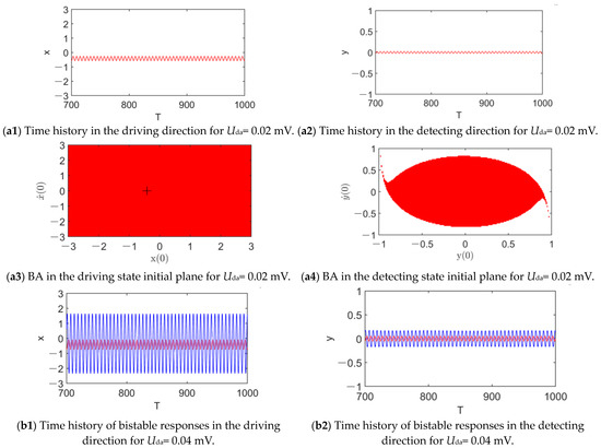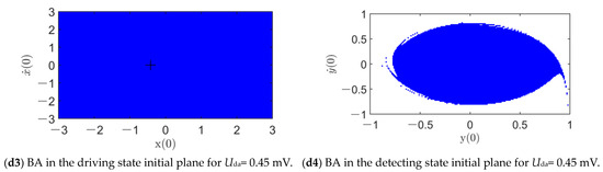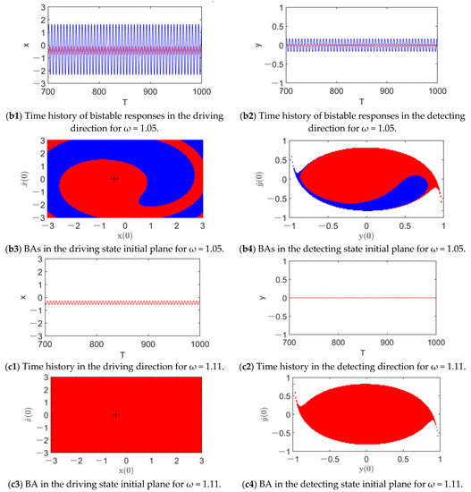 Third, due to the saddle-node bifurcation of the periodic solution, the nonlinear hardening behavior is typical right bending in the driving mode but right-down bending in the detecting mode. This indicates that, when the frequency of the driving AC voltage is within the right-side neighborhood of the natural frequency of the detecting mode, the increase in the driving AC voltage amplitude may induce bistability, and disturbances of the initial conditions may trigger jumps between bistable responses or dynamic pull-in, thus leading to the unreliability or insecurity of the micro gyroscope. Via the classification of basins of attraction, an applicable confident estimate of the system response can be developed to satisfy the stable output response of the gyroscope.