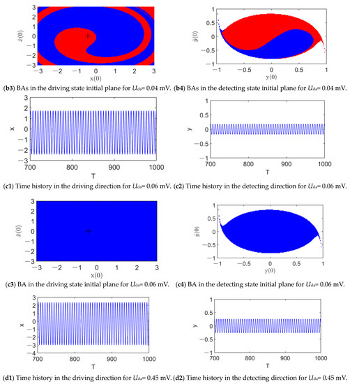 Therefore, in this study, two initial-sensitive phenomena of the MEMS gyroscopes, namely jump and pull-in instability, are investigated. The outline of this paper is as follows: First, the vibrating system of a typical electrostatic micro gyroscope and its unperturbed system are proposed; on this basis, the voltage threshold for the static pull-in of the detecting direction is analyzed. In Section 3, via the analysis of the local bifurcation of periodic solutions and the classification of basins of attraction, conditions for the coexistence of multiple responses and jumps are presented. Then, the phenomenon of pull-in instability is discussed analytically and numerically in Section 4. Finally, Section 5 and Section 6 contain the discussion and conclusions.
