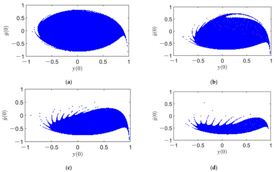 Figure 6. Evolution of safe basins of system (5) in the detecting state initial plane with the increase in Uda for ω = 1.03: (a) Uda= 0.50 mV; (b) Uda= 50 mV; (c) Uda= 55 mV; (d) Uda= 60 mV.