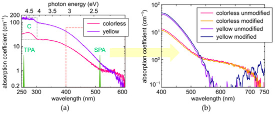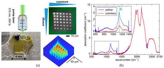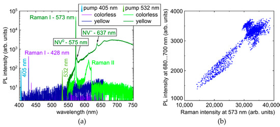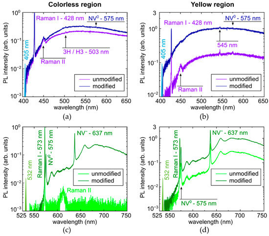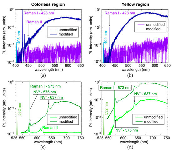 - PL intensities over the entire acquired range of 400–750 nm increase with the increasing initial [C] in the colorless and yellow regions, and exhibit saturation versus laser exposure, indicating the exhausting of C-centers. At first glance, this could imply that the underlying laser-generated color centers are nitrogen-containing, but another point is that electron-hole plasma in Ib-diamond occurs via two-photon ionization of C-centers [27] in the intrinsic absorption band ≈ 260 nm [7,18,19];
