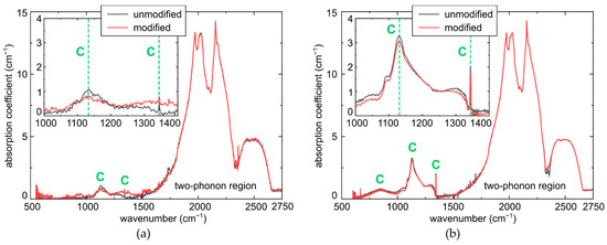 - C-centers are quite significantly exhausted in the micromarks, as shown by the considerable change Δα(C) ~ 0.2 cm−1 in their IR absorption in the 1130-cm−1 peak (also, in the 1344-cm−1 peak, Figure 4), accounting for the thickness scaling factor D0/D ~ 10–20 for the sample thickness D0 ≈ 0.5 mm and typical micromark lengths D ~ 20–40 μm;