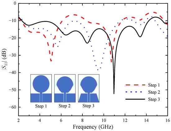 A single UWB antenna element design is based on a circular monopole antenna and the structuring of the antenna is conducted in three steps. The monopole antenna has the advantages of simple structure, easy installation and operation, small size, light weight and low cost. Figure 1 exhibits the antenna evolution. For “Step 1”, it can be seen from the simulation reflection coefficients that the antenna operates in the frequency bands from 2.24–6.12 GHz and 8.39–11.71 GHz, which cannot cover the desired frequency range. To extend the antenna working bandwidth, replace the lower half of the circular patch with two inverted trapezoid patches, as shown in “Step 2”. The working bandwidth changes to 2.41–11.59 GHz and 12.73–13.96 GHz. However, there is still a stopband between the two passband bands, and two right triangles are cut at the edge of the ground plane, as shown in “Step 3”. The working bandwidth of the antenna is changed to 2.31–14.55 GHz, which not only covers the UWB band, but also covers the X-band. Our investigation will be built around this UWB antenna element.