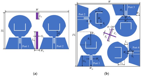 Figure 2. Schematic diagram of the UWB MIMO antenna structure: (a) two-element MIMO antenna, two rectangular branches (in purple bar) added into the middle to implement the isolation between two elements; (b) four-element MIMO antenna, cross-shaped branch (in purple line) added into the middle to implement the isolation between four elements.
