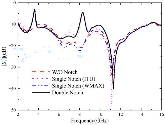 In order to avoid the interference problem of the narrowband communication system, U-shaped slots in the radiation patch of the UWB antenna and inverted U-shaped slots in the feeder are used to generate notch properties. In order to verify the mutual independence of the two notch structures, Figure 3 shows the |S|-parameter simulation curve corresponding to the UWB MIMO antenna when no notch structures and different numbers of notch structures are introduced, respectively.