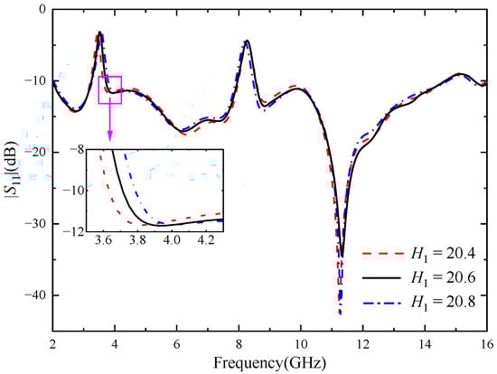 In order to study the influence of U-shaped slot and inverted U-shaped slot on the notch characteristics, the key dimensions of the two kinds of notch structures were parameterized and simulated. As shown in Figure 4, when L3 increases from 6.8 mm to 7.2 mm and other parameters remain unchanged, the center frequency of the notch band 3.28–3.75 GHz changes significantly, decreasing from 3.6 GHz to 3.5 GHz. When L3 = 7.0 mm, the stopband bandwidth of the antenna just covers the WiMAX band. Figure 5 shows the influence of the location of the U-shaped slot on antenna. When H1 increases from 20.4 mm to 20.8 mm, the center frequency of the 3.28–3.75 GHz notch band does not change significantly, but the stopband bandwidth gradually increases. It can be seen from the above analysis that the notch band can be controlled flexibly through adjusting the length and position of the slot.