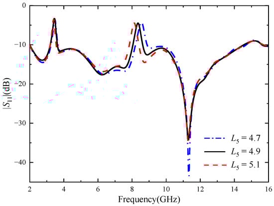 Figure 6 shows the reflection coefficient for different values of the key parameter L4 of the inverted U-shaped slot. As shown in Figure 5, when other parameters remain unchanged and L4 increases from 4.7 mm to 5.1 mm, the notch band 3.28–3.75 GHz does not change significantly, and the center frequency gradually decreases. Through optimizing the key parameters of the two notch structures, it can be seen that the U-shaped slot mainly affects the notch band at 3.28–3.75 GHz, and the inverted U-shaped slot mainly affects the notch band at 7.99–8.58 GHz, with little mutual interference.