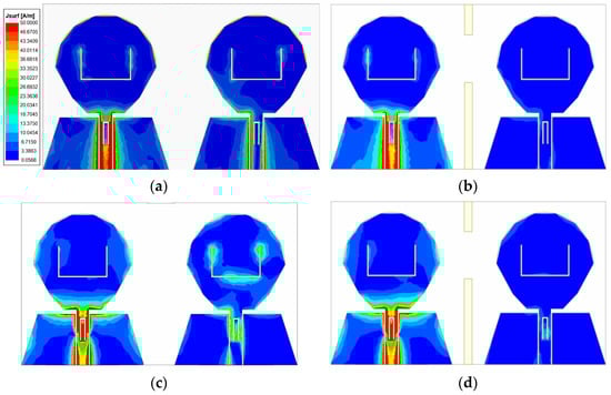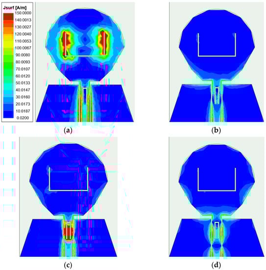 Figure 7. Antenna surface current distribution at four frequency points: (a) 3.55 GHz; (b) 5.5 GHz; (c) 8.25 GHz; (d) 12.5 GHz.