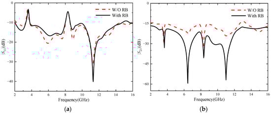 Figure 8. The |S|-parameters with or without RB: (a) |S11|; (b) |S21|.