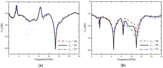 Figure 9. |S|-parameters with different L6, the unit of L6 size (mm): (a) |S11|; (b) |S21|.