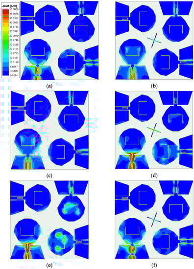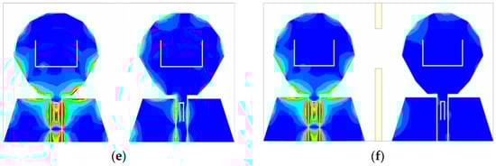 Figure 15. Antenna surface current distribution at (a) 4.5 GHz without adding cross-shaped branch; (b) 4.5 GHz with adding cross-shaped branch; (c) 7.25 GHz without adding cross-shaped branch; (d) 7.25 GHz with adding cross-shaped branch; (e) 11.6 GHz without adding cross-shaped branch; (f) 11.6 GHz with adding cross-shaped branch.