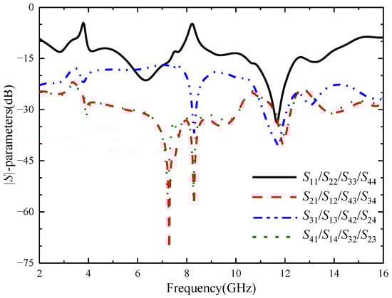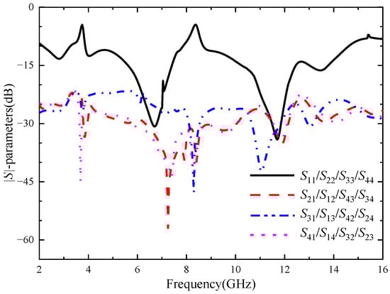 Figure 11. |S|-parameters of the four-element MIMO antenna.