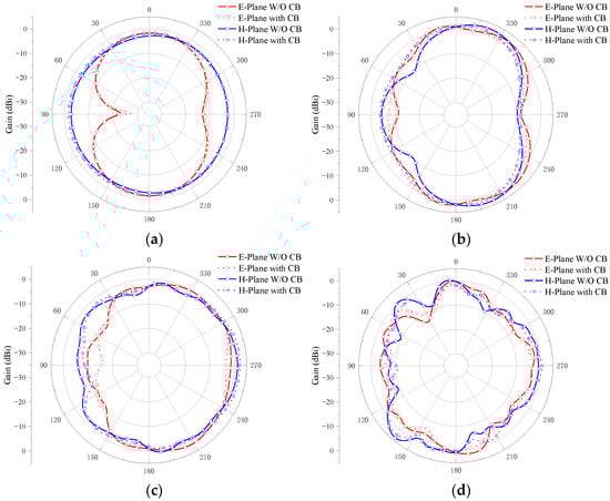 Figure 16. Four-element MIMO antenna simulation radiation pattern with and without adding cross-shaped branch (CB) at (a) 2.8 GHz; (b) 6.5 GHz; (c) 10.6 GHz; (d) 14.3 GHz.