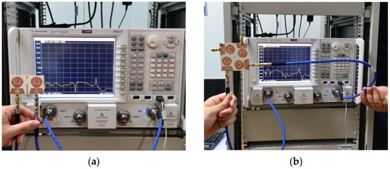 Figure 17. Photographs of the measured |S|-parameter scenarios using vector network analyzer Keysight N5244A: (a) two-element MIMO antenna; (b) four-element MIMO antenna.
