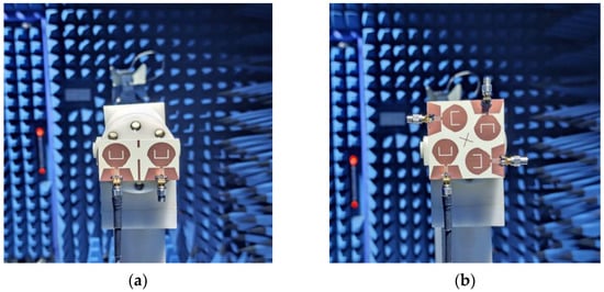 Figure 18. Photographs of far-field radiation pattern measurements using a microwave anechoic chamber: (a) two-element MIMO antenna; (b) four-element MIMO antenna.