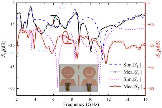 Figure 19. Simulation and measured |S|-parameters of the proposed two-element MIMO antenna; black circle with arrow means pointing to S11; red circle with arrow means pointing to S21.
