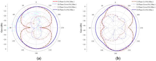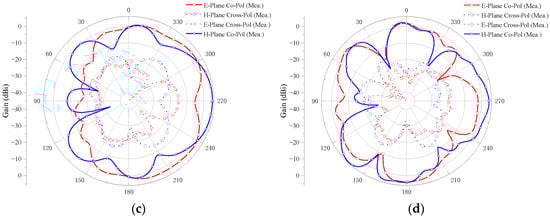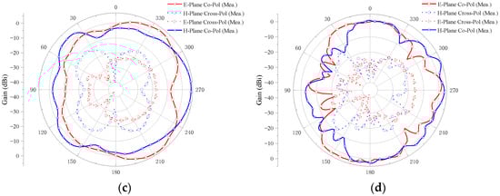 Figure 21. The measured radiation pattern of the proposed two-element MIMO antenna: (a) 2.8 GHz; (b) 6.5 GHz; (c) 10.6 GHz; (d) 14.3 GHz.