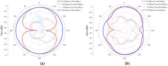 In order to verify the performance of the two MIMO antennas designed, the antennas are manufactured according to the data in Table 1. Both MIMO antennas are fed via coplanar waveguide (CPW) and printed on F4BTM440 dielectric substrates with a relative dielectric constant of 4.4 and a tangent loss of 0.0015. A vector network analyzer (N5244A) and microwave anechoic chamber were used to measure the MIMO antenna |S|-parameter and far-field radiation pattern, as shown in Figure 17 and Figure 18.