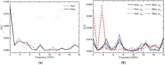 Figure 23. ECC of the proposed antenna: (a) two-element MIMO antenna; (b) four-element MIMO antenna.