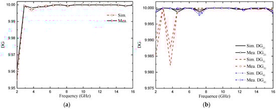 The measured and simulated DG of the two proposed MIMO antennas are shown in Figure 24. From Figure 24, we can confirm that the DG of the two MIMO antennas is very close to 10 dB, and the maximum value is 9.98 dB. We also noticed that the value of the diversity gain was very similar for the simulated and measured cases.