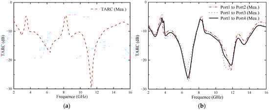 Figure 25. Measured TARC of the proposed antenna: (a) two-element MIMO antenna; (b) four-element MIMO antenna.