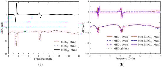 Figure 26. Measured MEG of the proposed antenna: (a) two-element MIMO antenna; (b) four-element MIMO antenna.