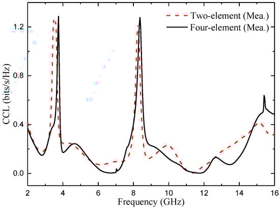 The correlation between the elements in MIMO channel systems produces a capacity loss [30]. For high data transfer, the value of CCL should be below 0.4 bits/s/Hz [31]. CCL is calculated using Formulas (10)–(12):