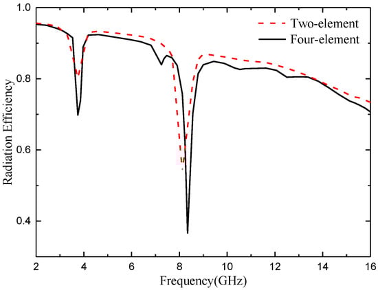 Figure 28. Measured radiation efficiency of the proposed antenna for 2- and 4-element antennas.