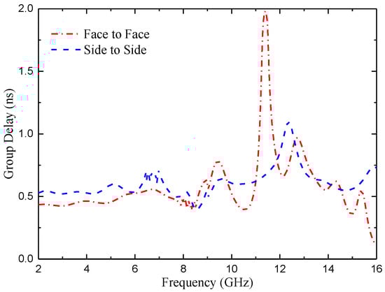 The group delay of the antenna in the above two directions is shown in Figure 30. For a good wideband antenna configuration, the group delay should be minimal and constant throughout the operating bandwidth. It can be observed from the figure that in the operating band of the proposed antenna, the group delay remains stable at about 0.5 ns.