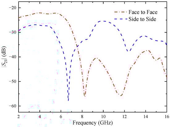 Figure 8 shows the comparison of |S|-parameters before and after antenna loading RBs: (a) represents |S11|, (b) represents |S21|. As can be seen from Figure 8a, loading RB will deteriorate the antenna’s impedance matching in the 4–10 GHz frequency band, but the influence is small and the antenna can still meet the performance indexes of UWB antennas. As can be seen from Figure 8b, when the RBs are not loaded, the antenna’s isolation degree is lower than 15 dB in the 8.7–8.9 GHz and 12.64–13.41 GHz bands, and the isolation effect is poor, which does not meet the basic requirements for designing MIMO antennas. However, after loading the RBs, the antenna isolation is obviously improved, especially in the 5–13 GHz frequency band, the antenna isolation is higher than 20 dB, and the antenna isolation is also higher than 17 dB in the other frequency bands of the working frequency band, with an average increase of about 7 dB, indicating an obvious isolation effect. In short, figures (a) and (b) show that RBs effectively inhibit electromagnetic coupling between antenna elements and significantly improve the isolation degree between elements. At the same time, the |S11| of the antenna changed little and remained below −10 dB in the UWB band, and the antenna did not exhibit an impedance mismatch phenomenon.